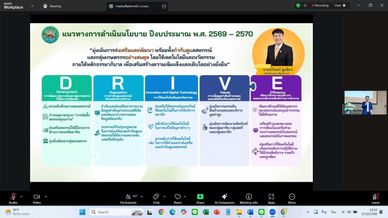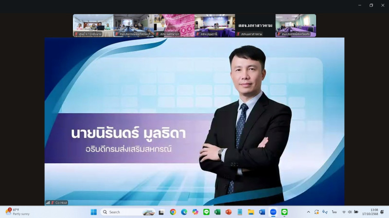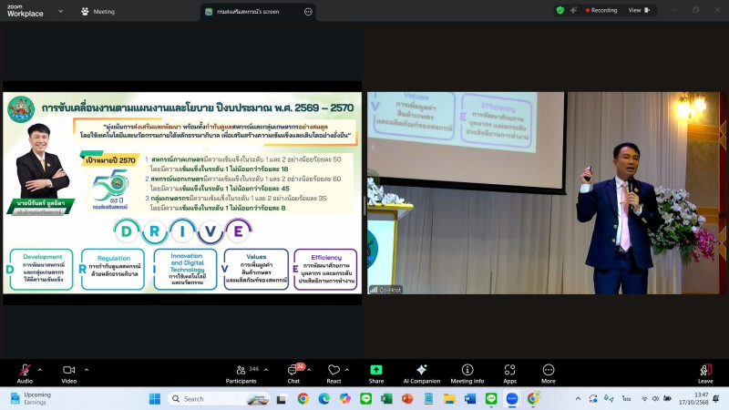 17 ตุลาคม 2568 บุคลากรศูนย์ถ่ายทอดเทคโนโลยีการสหกรณ์ที่ 13 จังหวัดชัยนาท เข้ารับฟังนโยบายเพื่อ “การขับเคลื่อนงานตามแผนงานและนโยบายปีงบประมาณ พ.ศ. 2569 – 2570 CPD Drive” จากนายนิรันดร์ มูลธิดา อธิบดีกรมส่งเสริมสหกรณ์ เพื่อให้บุคลากรกรมส่งเสริมสหกรณ์ได้รับทราบและนำไปปฏิบัติให้เห็นผลอย่างมีประสิทธิภาพ ถ่ายทอดสัญญาณผ่านระบบ Zoom Metting