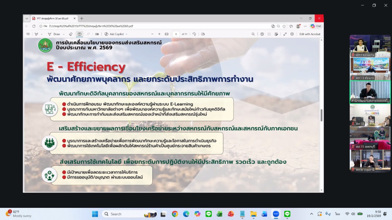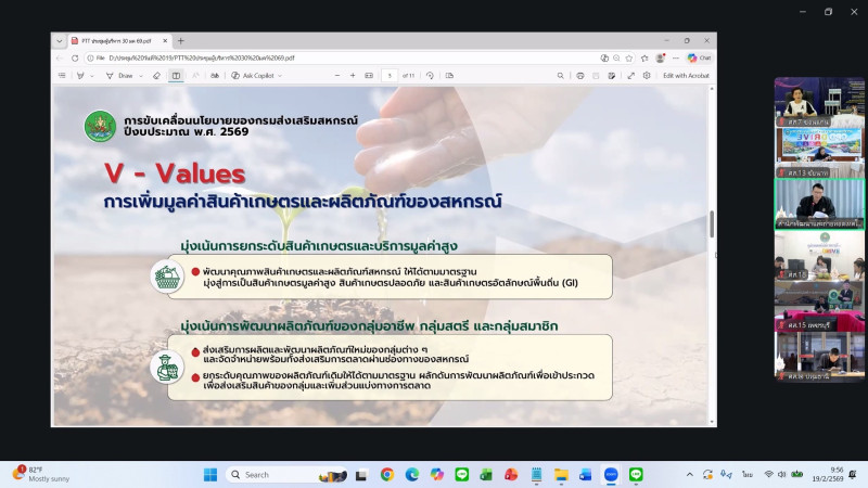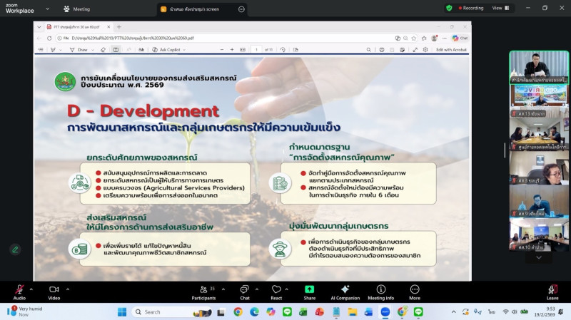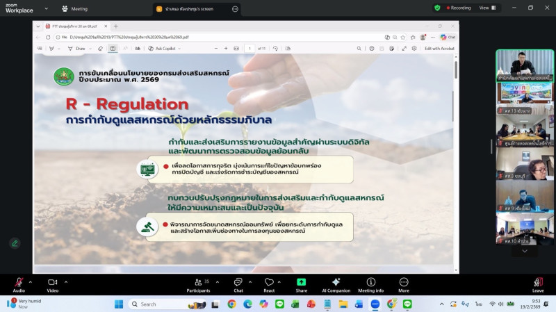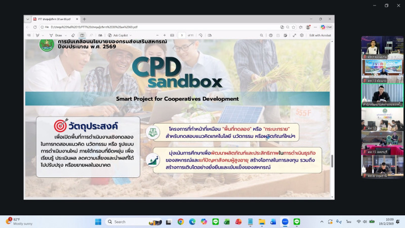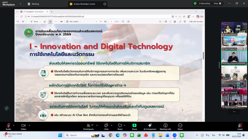 19 กุมภาพันธ์ 2569 นางสาวมนกรณ์ ยอดใจ ผู้อำนวยการศูนย์ถ่ายทอดเทคโนโลยีการสหกรณ์ที่ 13 พร้อมด้วยบุคลากร เข้าร่วมประชุมขับเคลื่อนนโยบายของกรมส่งเสริมสหกรณ์ ปีงบประมาณ พ.ศ. 2569 (CPD DRIVE และ CPD Sandbox) โดยมีนายอนุรัตน์ เลื่อนลอย ผู้อำนวยการสำนักพัฒนาและถ่ายทอดเทคโนโลยีการสหกรณ์เป็นประธาน ถ่ายทอดสัญญาณผ่านระบบ Zoom Meeting ณ ห้องประชุม ฝ101 ชั้น 1 อาคารฝึกอบรมส่วนกลาง สำนักพัฒนาและถ่ายทอดเทดโนโลยีการสหกรณ์ เขตดุสิต กรุงเทพมหานคร